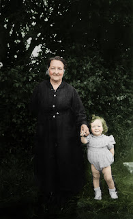 In the photo found among my grandparents' things, she would be about 75 years old. She is posing with one of her great-grandchildren (let us not comment on the fashion of the day), probably near her home, apparently in Barret (16).
