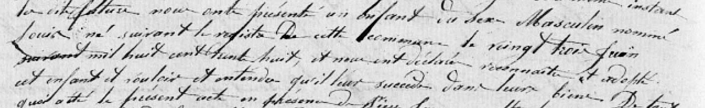 Au même instant la dite future nous a présenté un enfant de sexe Masculin nommé Louis né suivant le registre de cette commune le vingt trois juin mil huit cent trente huit, et nous ont déclaré reconnaître et adopté cet enfant et vouloir et entendre qu'il leur succédera dans leurs biens.