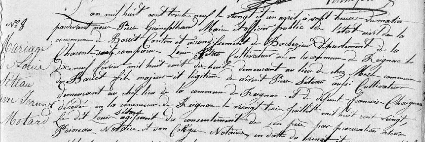 C'est le cas des MOT(T)ARD parmi mes ancêtres. Ma première rencontre avec cette lignée est surevenue quand je remontais les CETEAU. Je suis tombé sur le mariage de Louis CETEAU (SETEAU dans l'acte; les CETEAU ont la fâcheuse habitude de changer l'orthographe de leur nom à chaque génération, parfois plus d'une fois), fils de Pierre SETEAU et de Francoise CHAIGNEAU, avec Jeanne MOTARD le 21/04/1839 a Barret (Charente).