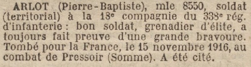 Pierre Baptiste died during the fighting at Pressoire on 15/11/1916.