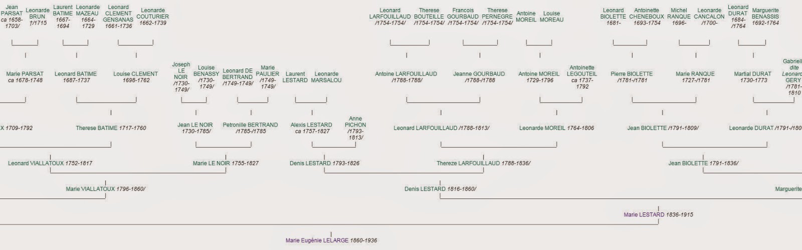 Les familles LELARGE et LESTARD et leurs ascendants sont originaires de Royère et Gentioux aussi loin que les registres remontent. J'ai donc pu remonter la filière très rapidement avec un minimum de recherche en lisant les registres d’état civil et en cherchant sur le site GenDep23.